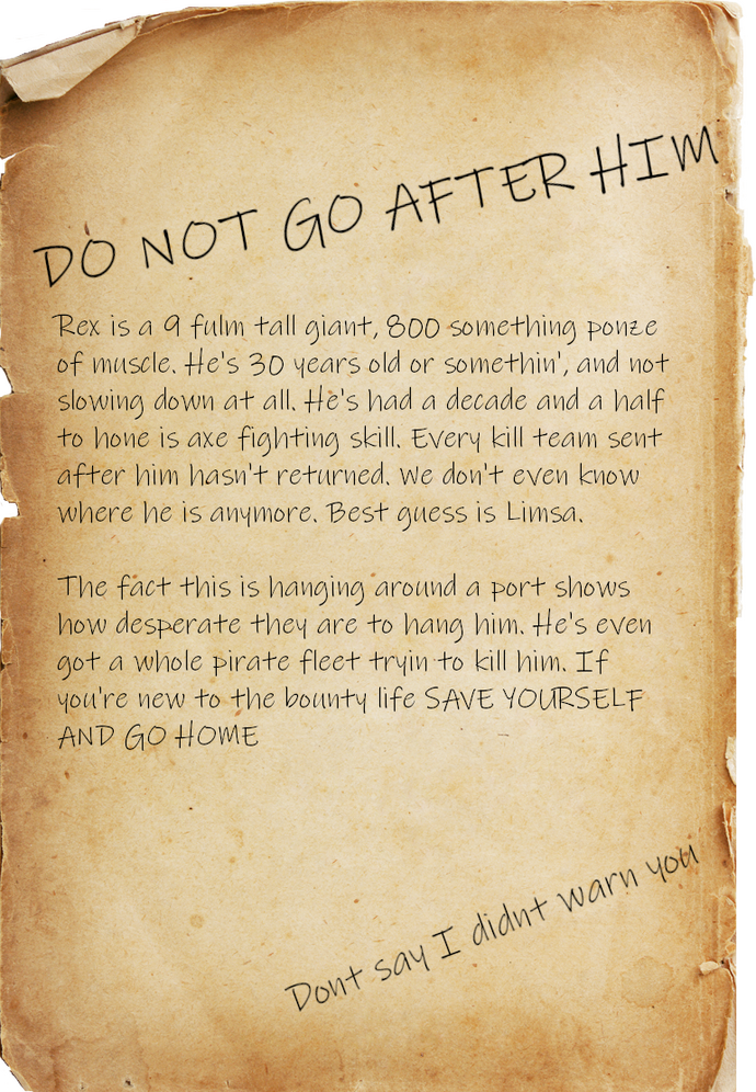 The Captain's freshly severed hand plops on the deck, the clang of his sword following shortly after. Rex stood there in awe, hushed murmurings from the crew around him. Captain Blackteeth gave a command: kill Rex. He pushed through the crowd, knowing that his only chance at survival was getting off this damn boat. He was close to death as it was, there was no way he'd be able to fight the entirety of the crew. He lept overboard. Who knew that saltwater felt like fire in open wounds._"One way ticket to Limsa O'minsa. Ain't comin' back here, chap?"-Unnamed ferrymanRex had finally washed ashore. The sun had set a while ago. Probably for the best, as not only were the lawmen looking after him, but a whole damn pirate empire. He managed to staunch the bleeding. Sitting on the beach now, he took tally of what he had on him: torn clothes, one handaxe (good for throwing), sturdy boots, and enough gil to get him out of this damn country.